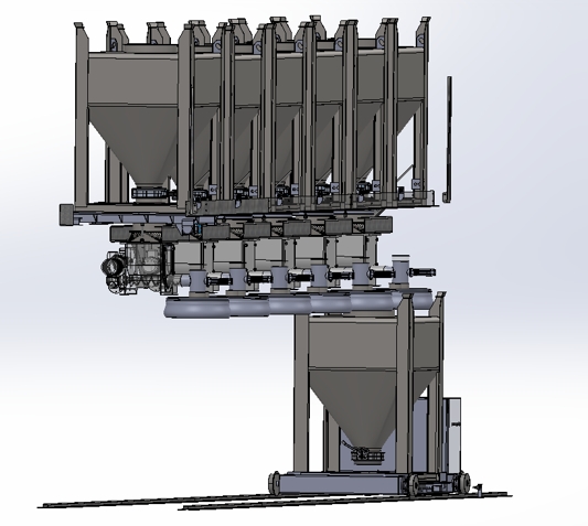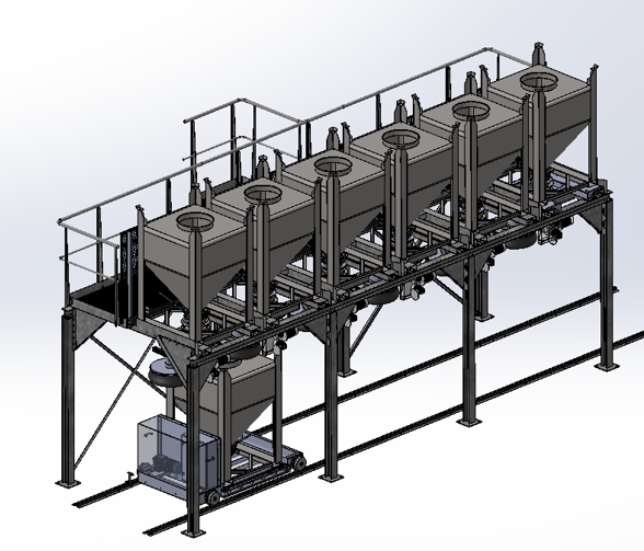 Deze installatie kan tot zes verschillende producten in één bin doseren. Grote vaten vullen gebeurt via een doseerwagen. Die verplaatst zich automatisch naar de juiste posities en weegt telkens de correcte hoeveelheid af, volgens het recept.